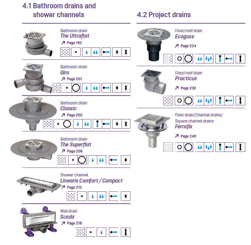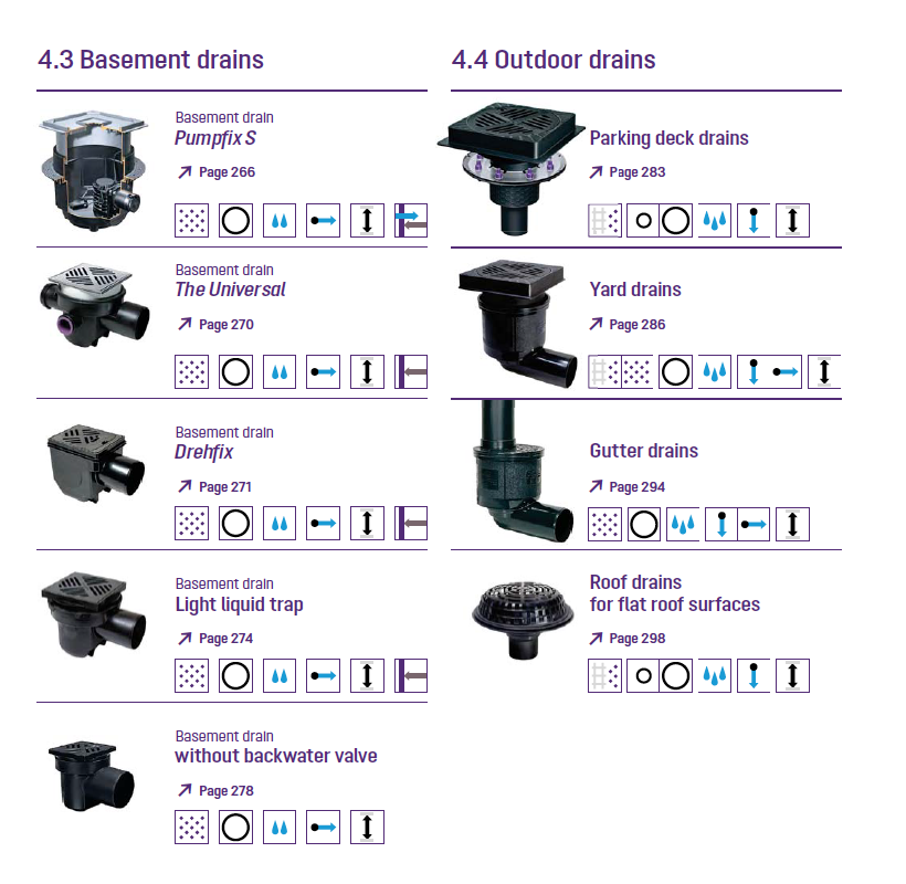 The drainage products displayed within each graphic can be found on the page indicated within the catalogue hosted below.