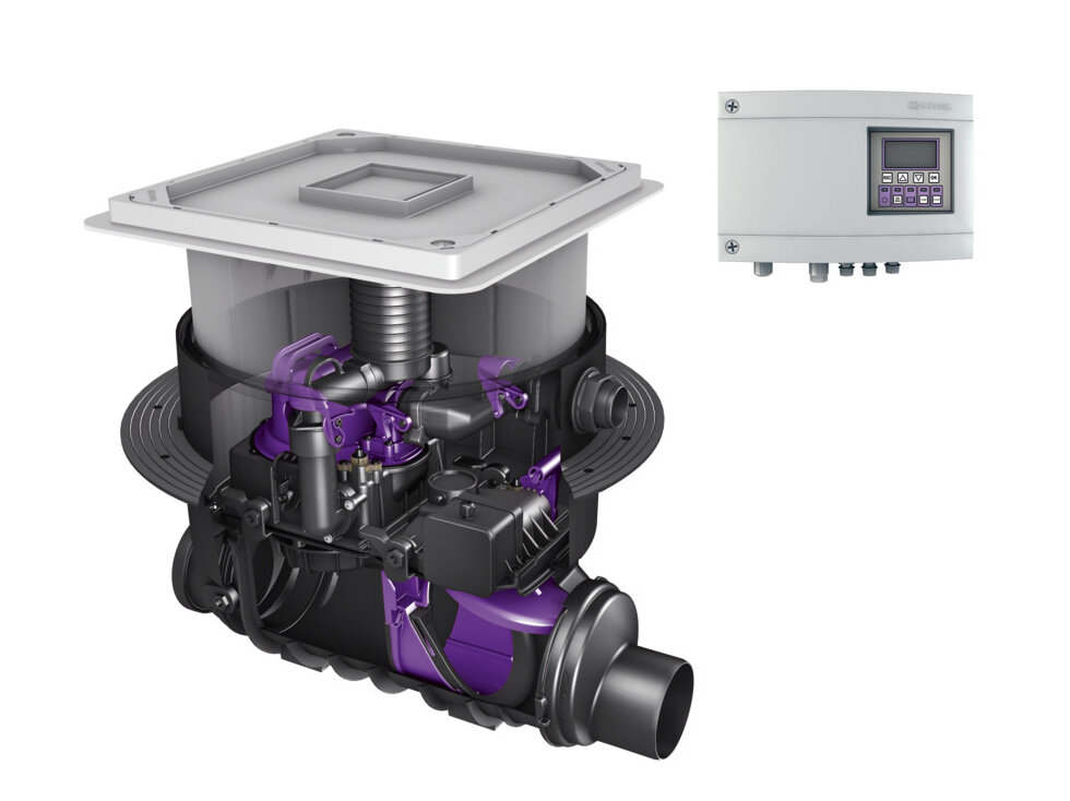 Whenever there is a gradient from the drainage points to the sewer, a hybrid lifting station can be used as a backwater protection system. In normal operation, it uses gravity to drain water without any power consumption. Only in the event of backwater does it begin to pump the wastewater into the backwater loop, or directly back into the pipe down stream of the unit, so that the connected drainage elements can continue to be used.
