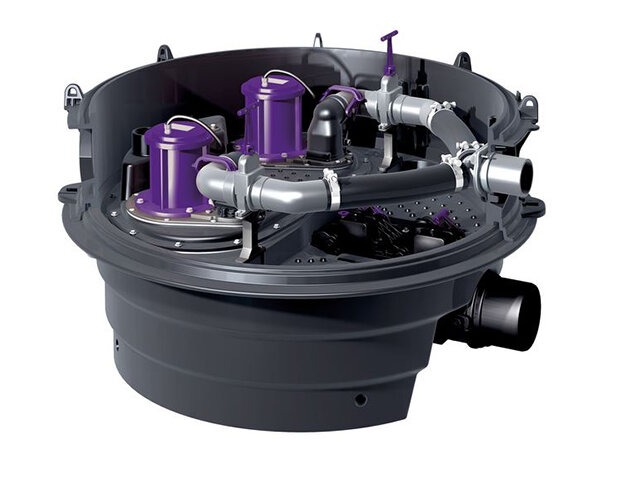 Hybrid lifting stations use direct drainage, the natural slope to the sewer. Wastewater is only disposed of by a pump in the event of backwater. This direct route is economical, safe and quiet because hybrid lifting stations work most of the time without power and always without interruptions in operation. They have significantly lower pump wear and only make pump noise in an emergency.