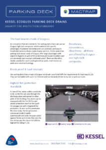 For parking deck drains we use our Ecoguss high-tech composite, which combines the specific advantages of polymer and metal and is an economic and easy to install alternative to drains made of grey cast iron. At the same time, parking deck drains made of Ecoguss offer large advantages with regard to hygiene as well as fire protection and sound insulation and are extremely load resistant and break-proof. There are therefore ideally suitable for use in underground car parks, multi-storey car parks and industrial buildings.