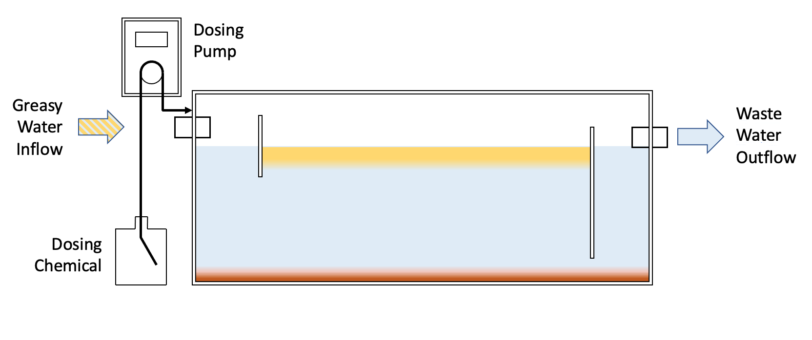 Grease Converters (MACTRAP Grease Converter ChemiClean) are usually installed internally, under a bench, and close to the sink where the waste water containing the FOG flows out. Similarly to GRU, they are usually made from stainless steel, but polymer versions are available where minimising cost is important. Grease Converters are fitted with an automatic dosing pump which pumps a set amount of bio-enzyme or equivalent into the tank. Wastewater with FOG flows into the trap and this is broken down by the enzyme. The FOG (non-congealing) flows in solution with the wastewater into the wastewater system.