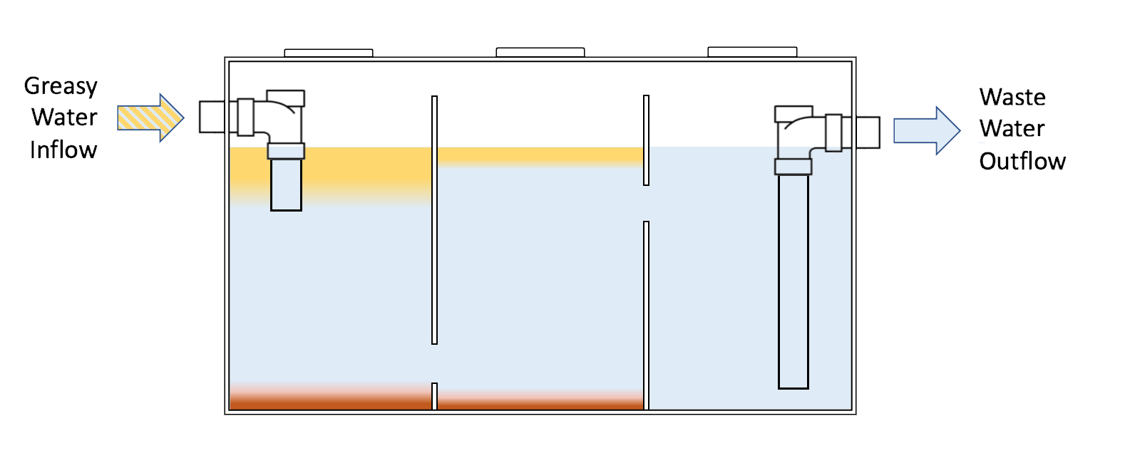 Passive grease traps (MACTRAP Grease Traps) are large tanks, designed to hold and slow the flow of wastewater so that the Fat, Oil and Grease (FOG) can separate and be prevented from entering the Councils wastewater network. The passive grease trap has baffles which slow the flow of waste water from kitchen sinks or other kitchen waste water outlets. This slowing process allows the FOG to rise to the surface, heavier food scraps and sediment to sink to the bottom, and the cleaner separated water to flow out of the trap and into the wastewater system. Over time the FOG builds up (along with sediments) and the trap has to be emptied by a professional tank cleaning agent.